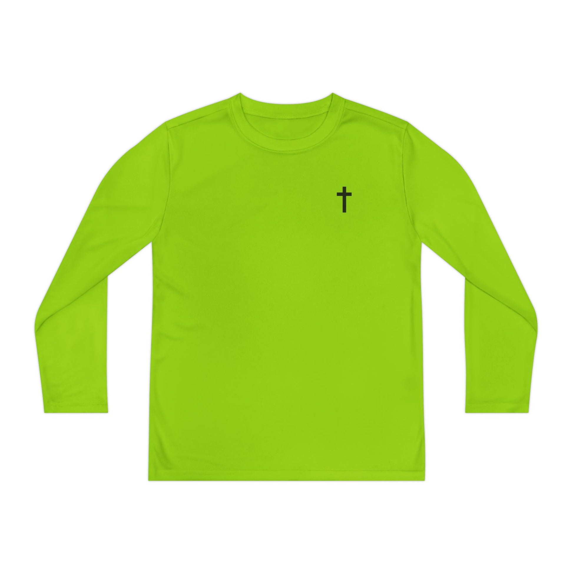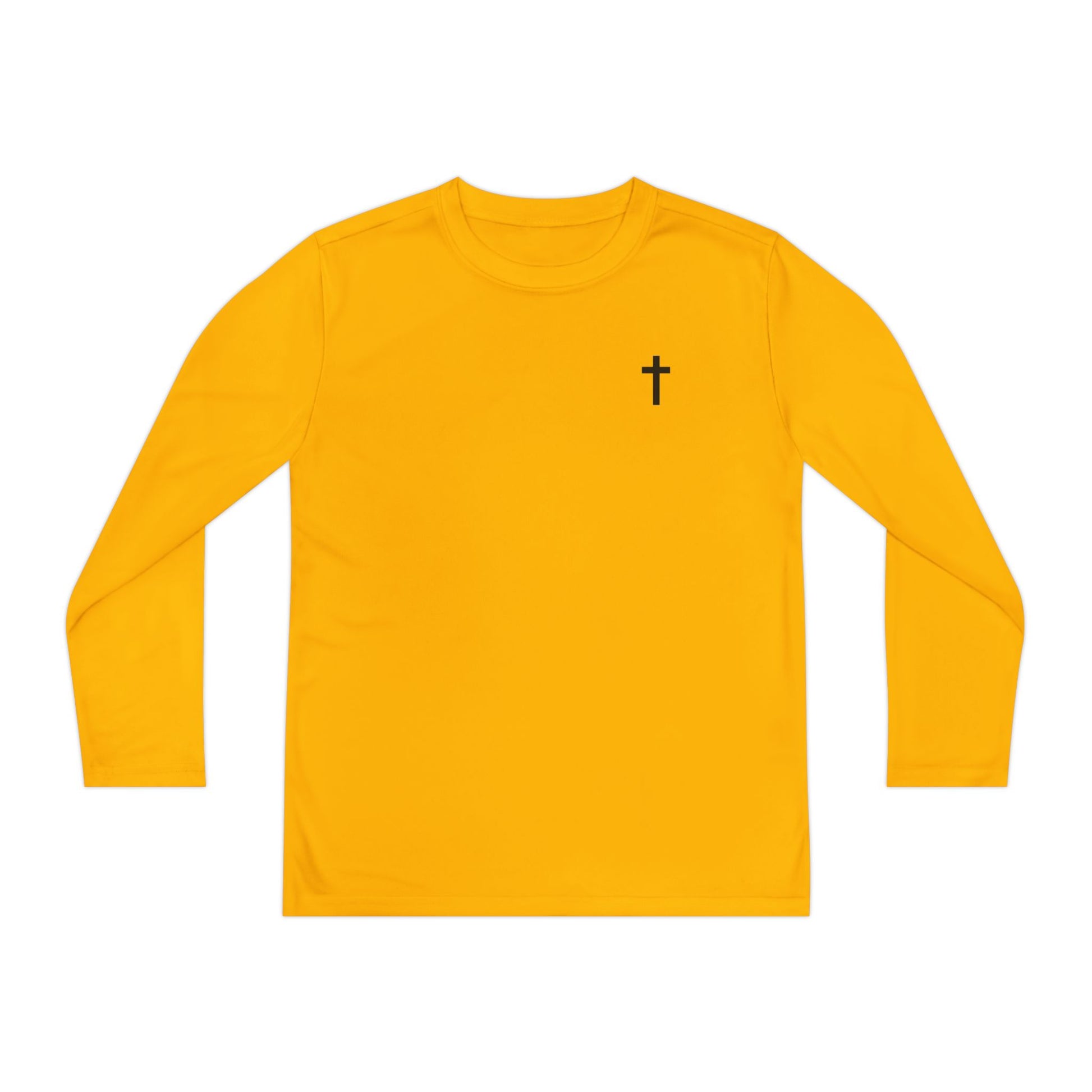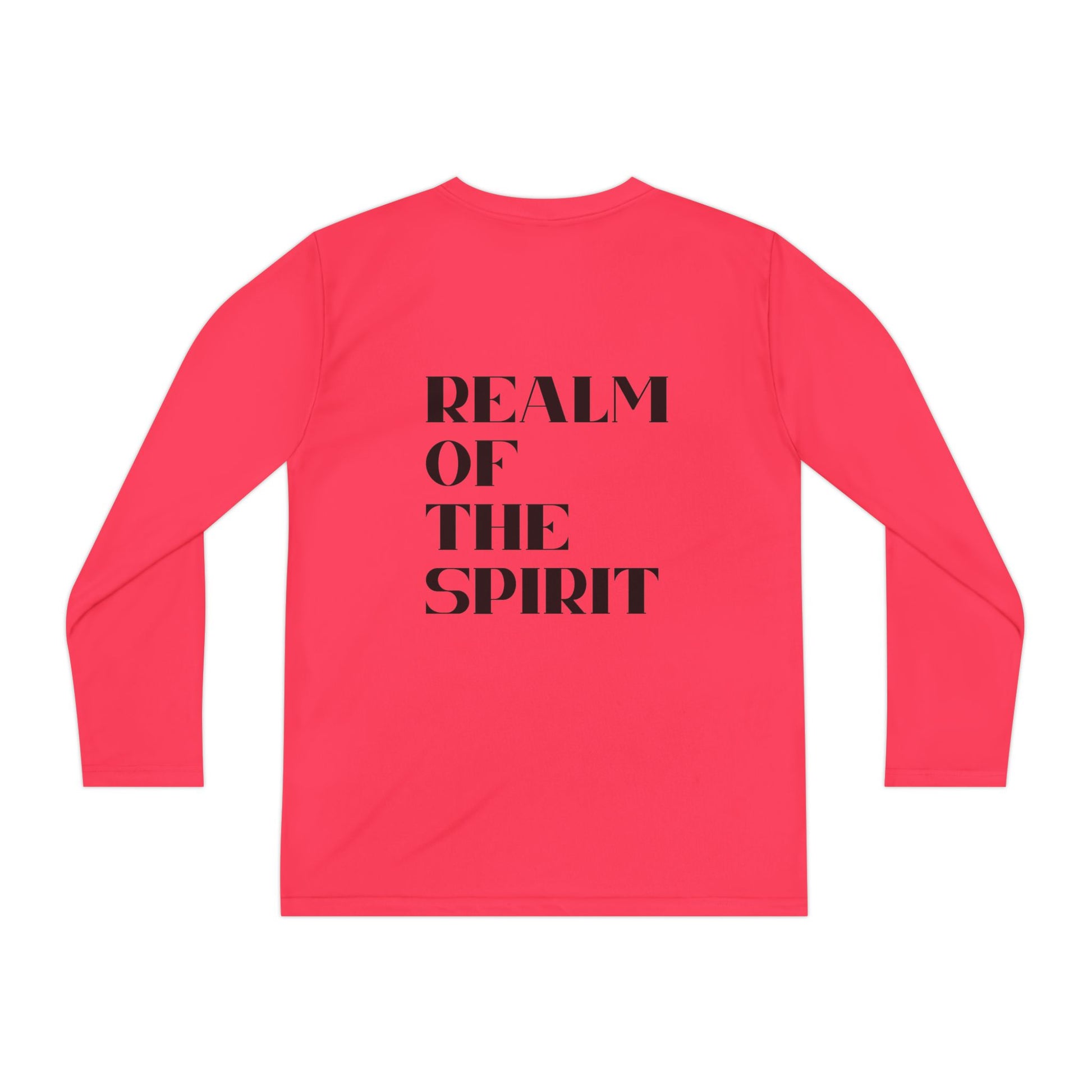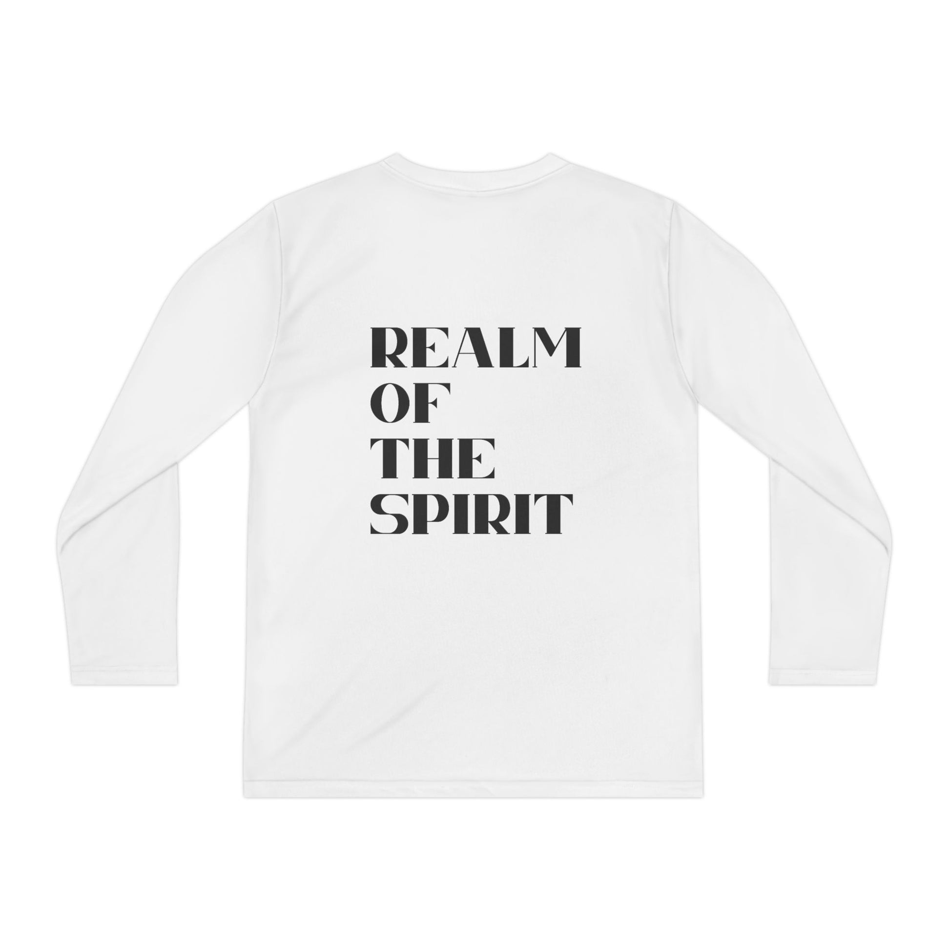 The Youth Realm of the Spirit Long Sleeve Tee offers a cool and athletic vibe, perfect for young individuals who enjoy an active lifestyle. This moisture-wicking polyester shirt is ideal for sports, workouts, or casual wear. A great choice for birthdays, holidays, or everyday wear.